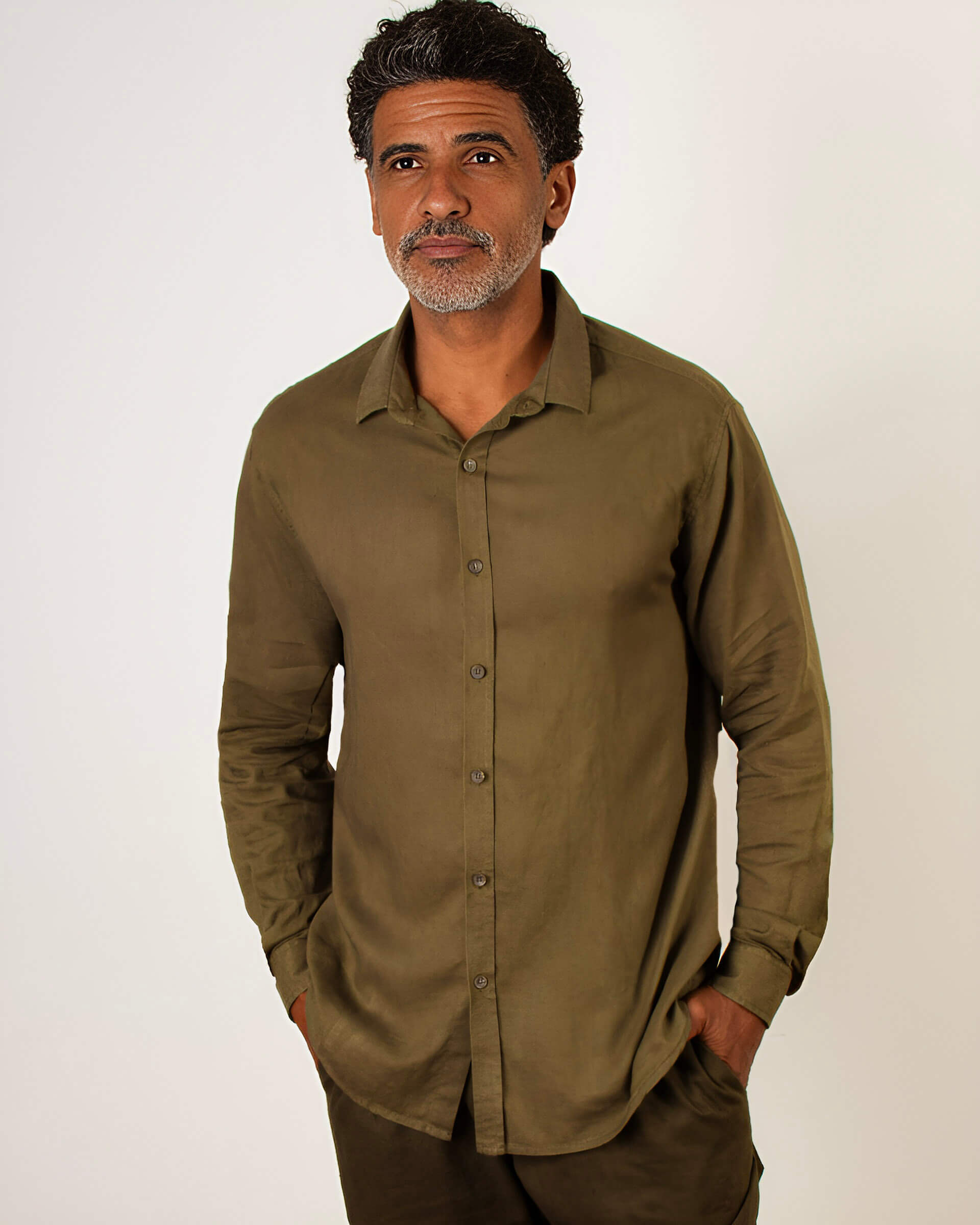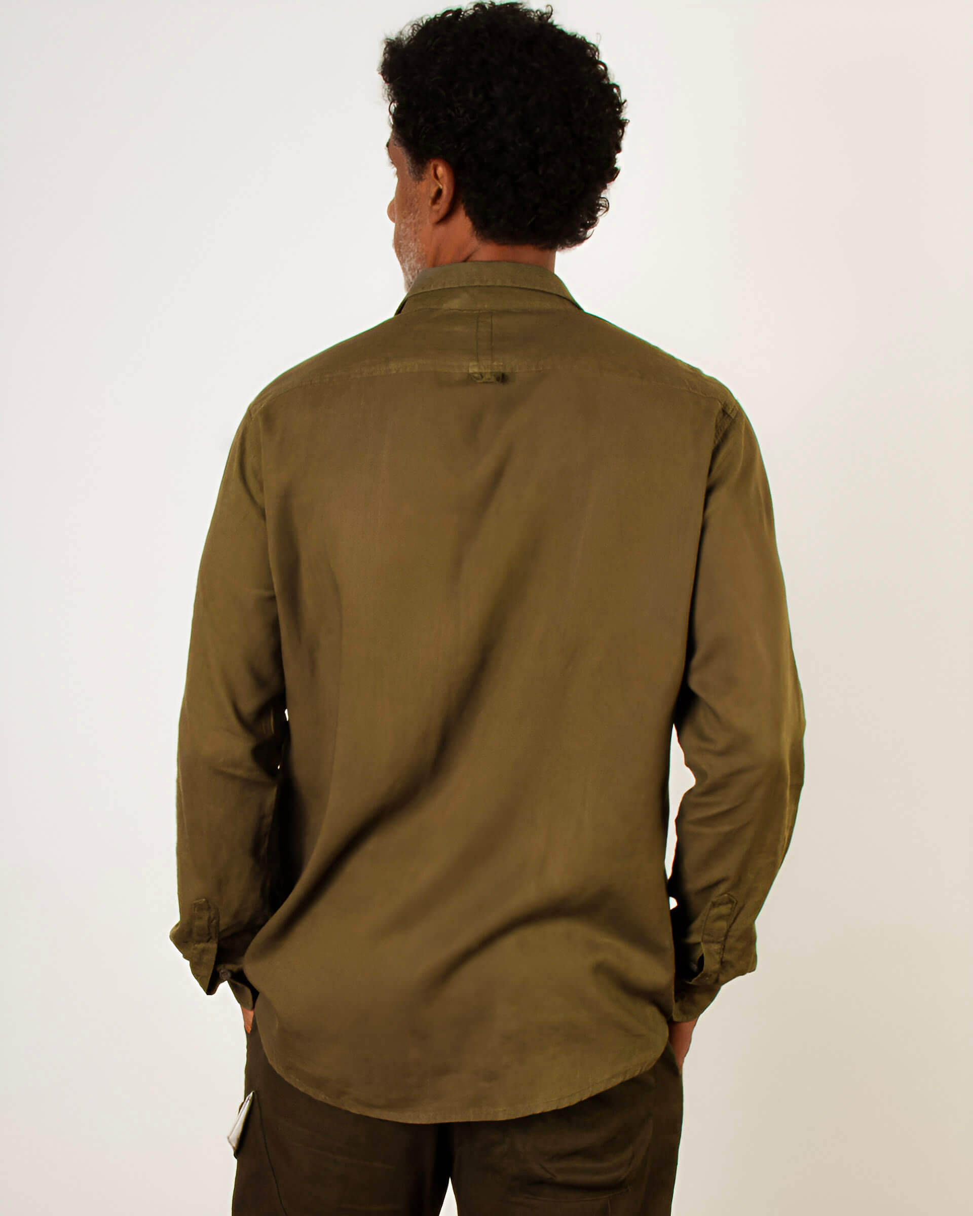 A Camisa de Linho Verde Oliva traz a sofisticação dos tons terrosos para o guarda-roupa masculino. Uma cor que transmite serenidade e confiança, funcionando como um "novo neutro" que combina tanto com calças claras (bege/areia) quanto com jeans ou preto.